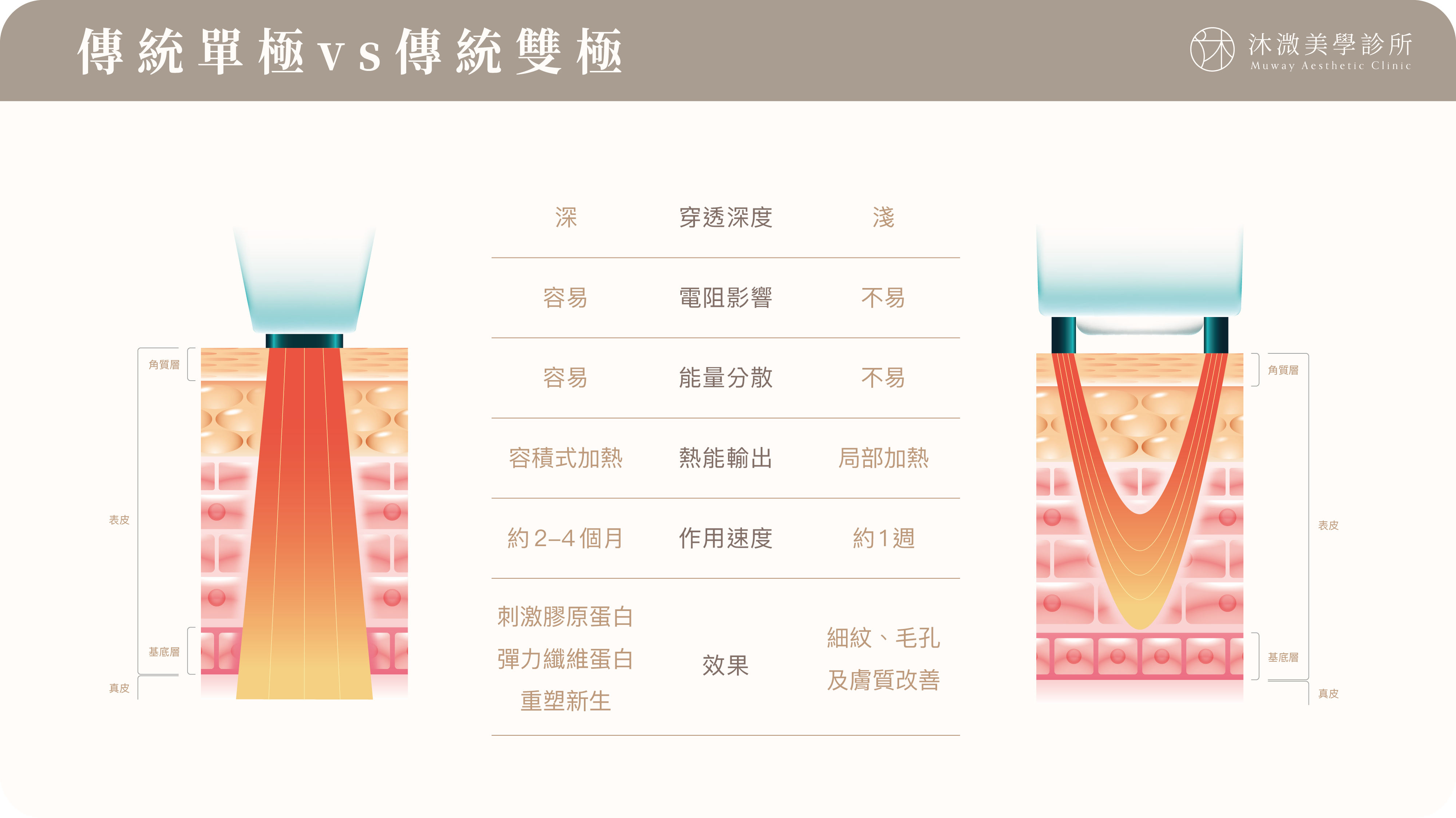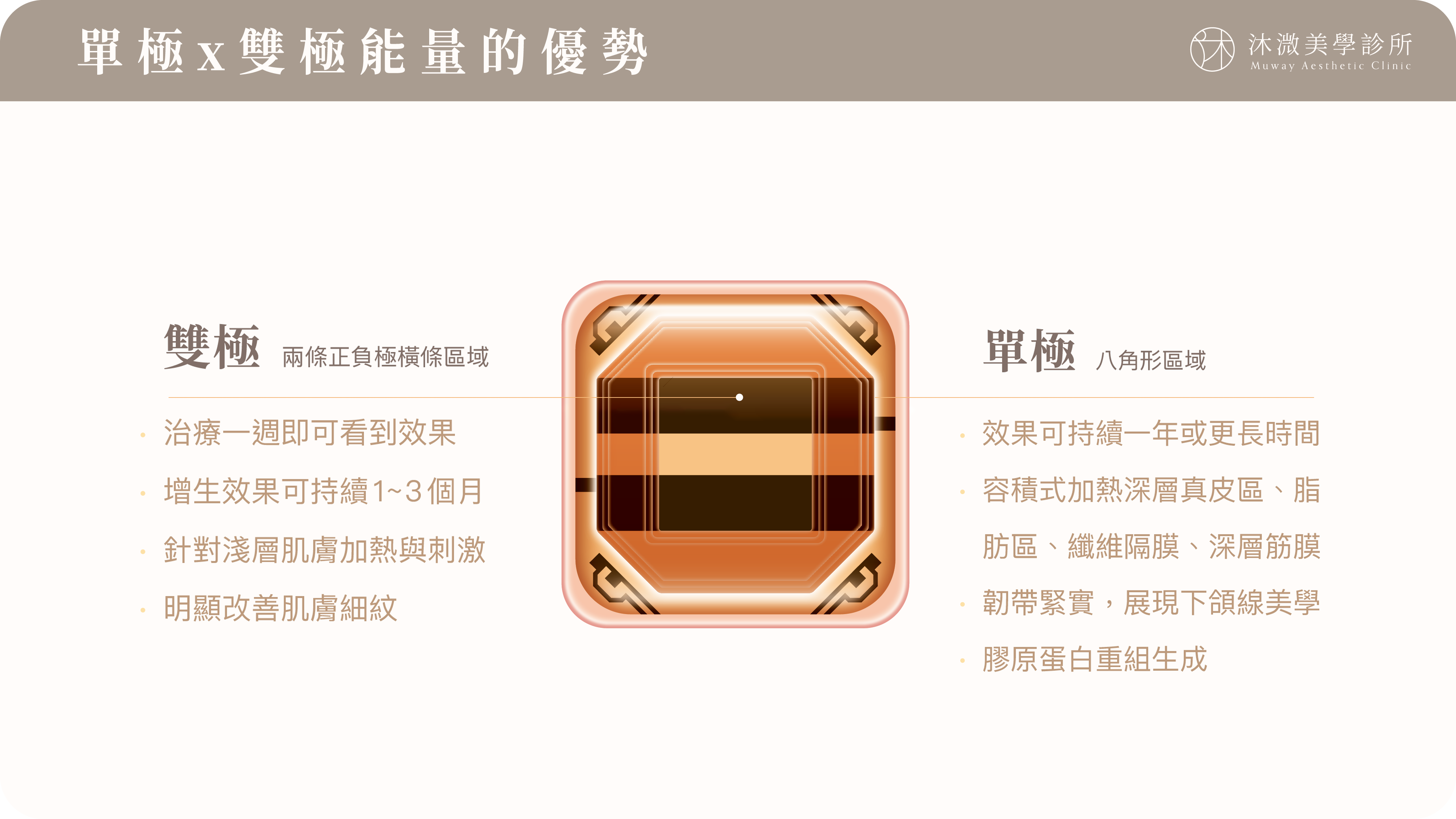 無雙電波結合單極和雙極電波,利用單極電波深入傳導至真皮深層與筋膜層,刺激結構性支撐力重建,同時以雙極電波進行表層大面積加熱,改善膚質與毛孔粗大。使無雙電波能夠同時處理「深層鬆弛」與「表層粗糙」問題。