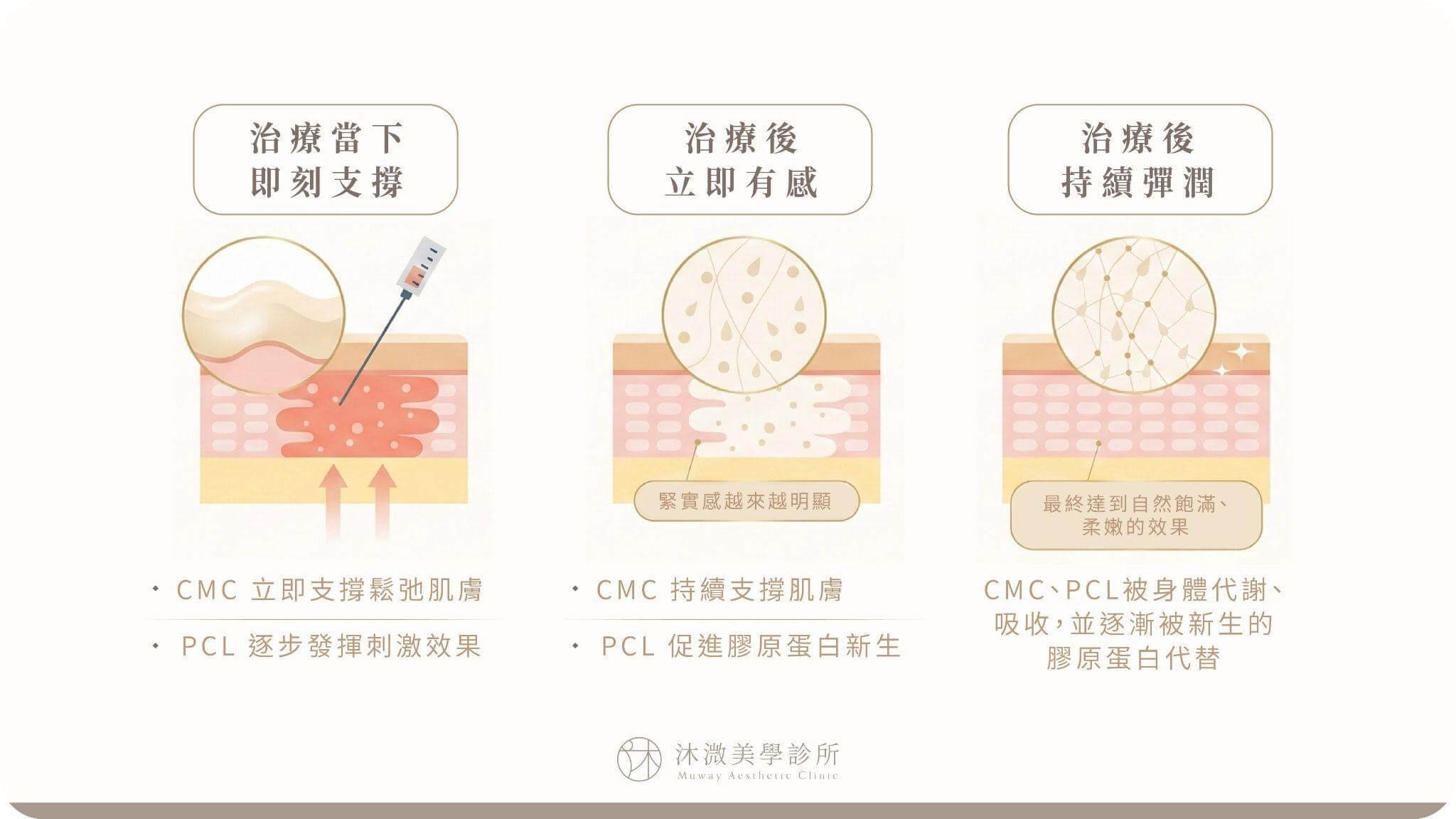 CMC凝膠載體漸漸被吸收的同時,PCL微粒子會不斷刺激結締組織,讓新生的結締組織搭起支撐肌膚的彈性支架,取代原本CMC凝膠載體被人體分解後的空間,讓肌膚用天然的方式變得平順光滑。
