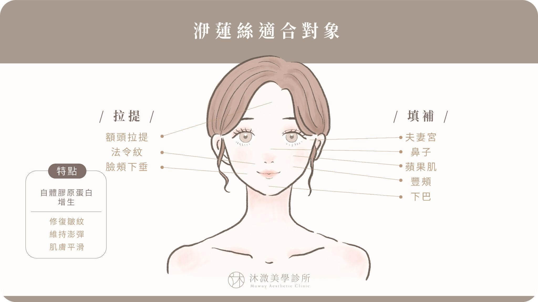 除了眉間,眼皮,及嘴唇不能施打外,全臉部位有重大凹陷或對臉部立體度不滿意者皆可施打。