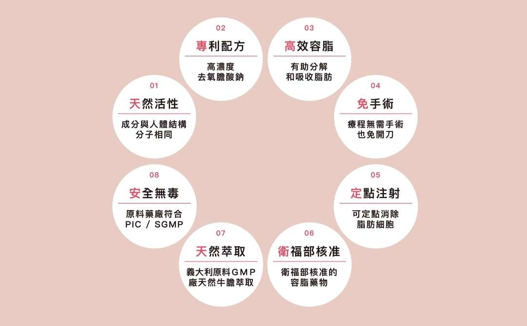容脂針專利配方中具有高濃度的去氧膽酸(DCA)成分,其活性成分與人體腸道代謝時所產生的天然物質結構分子相同,有助於分解和乳化脂質,達到消滅皮下脂肪的作用。原料萃取自天然牛膽,不含有毒或不純物質,且製程未使用任何高毒性溶劑,確保成分來源安全有保障。