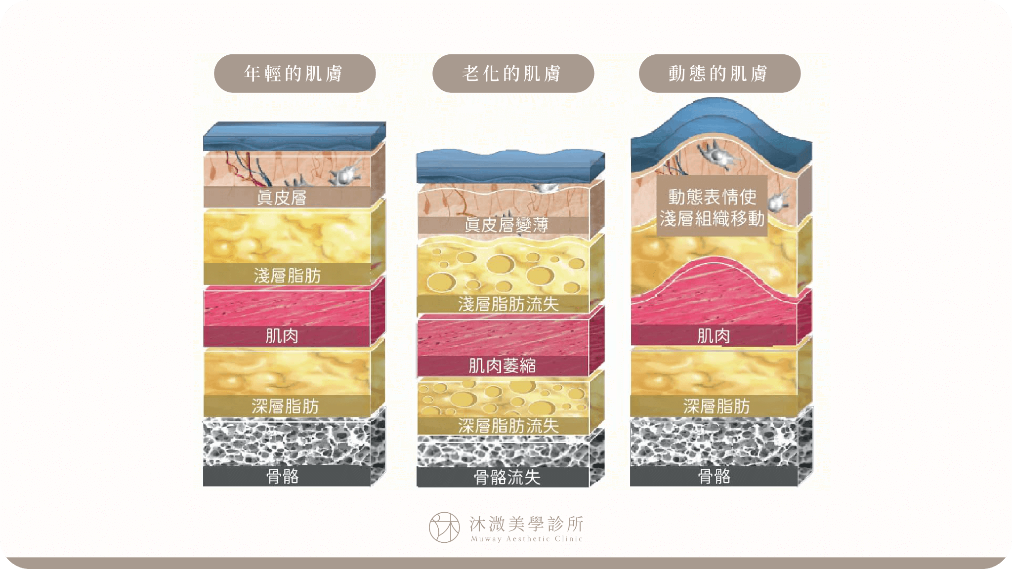 肌膚狀態並非一成不變,隨著動態表情與歲月流逝帶來的老化現象,都影響著肌膚不同組織層次的變化與作用。