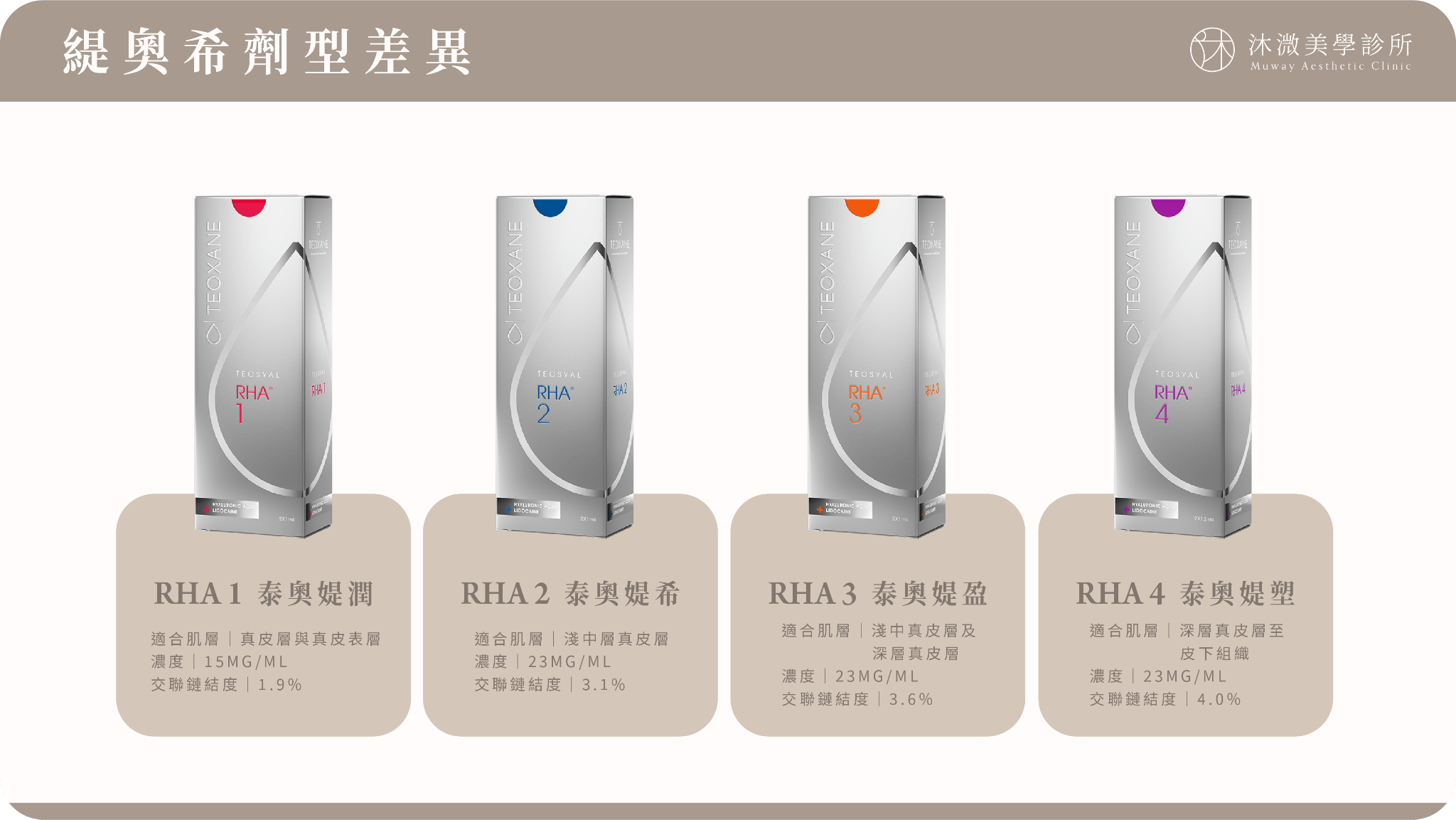 緹奧希隱形玻尿酸在台灣上市 4 種不同劑型,可針對不同部位、治療深度選擇適合的劑型,獲得全方位的改善。